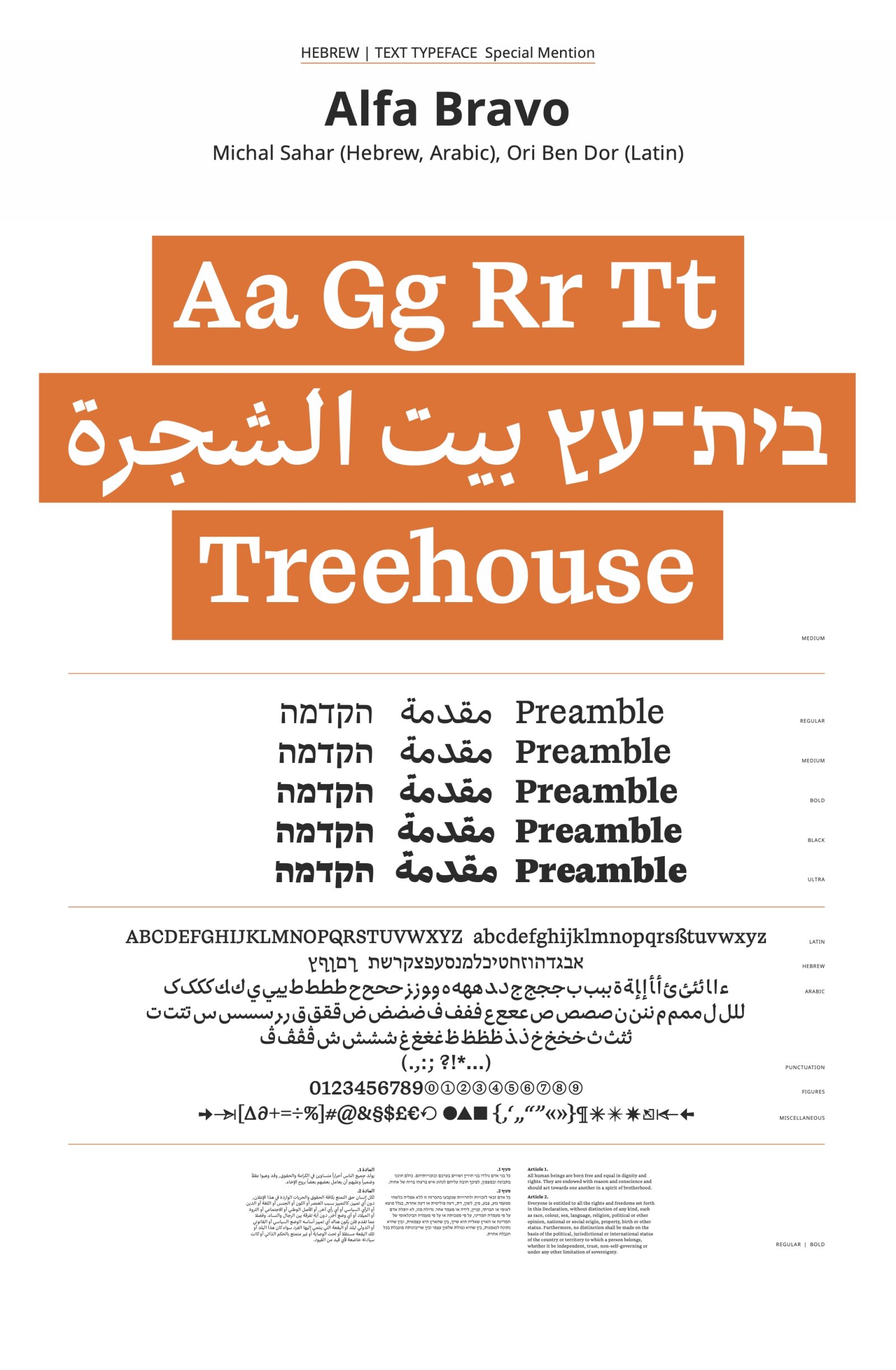 The original design approach and unexpected execution demonstrates an innovative thinking of Hebrew letterforms, pushing further the boundaries of current Hebrew type design. In order to highlight this notable aspect the typeface was reassigned to the Hebrew category, excluding the Arabic and Latin design.