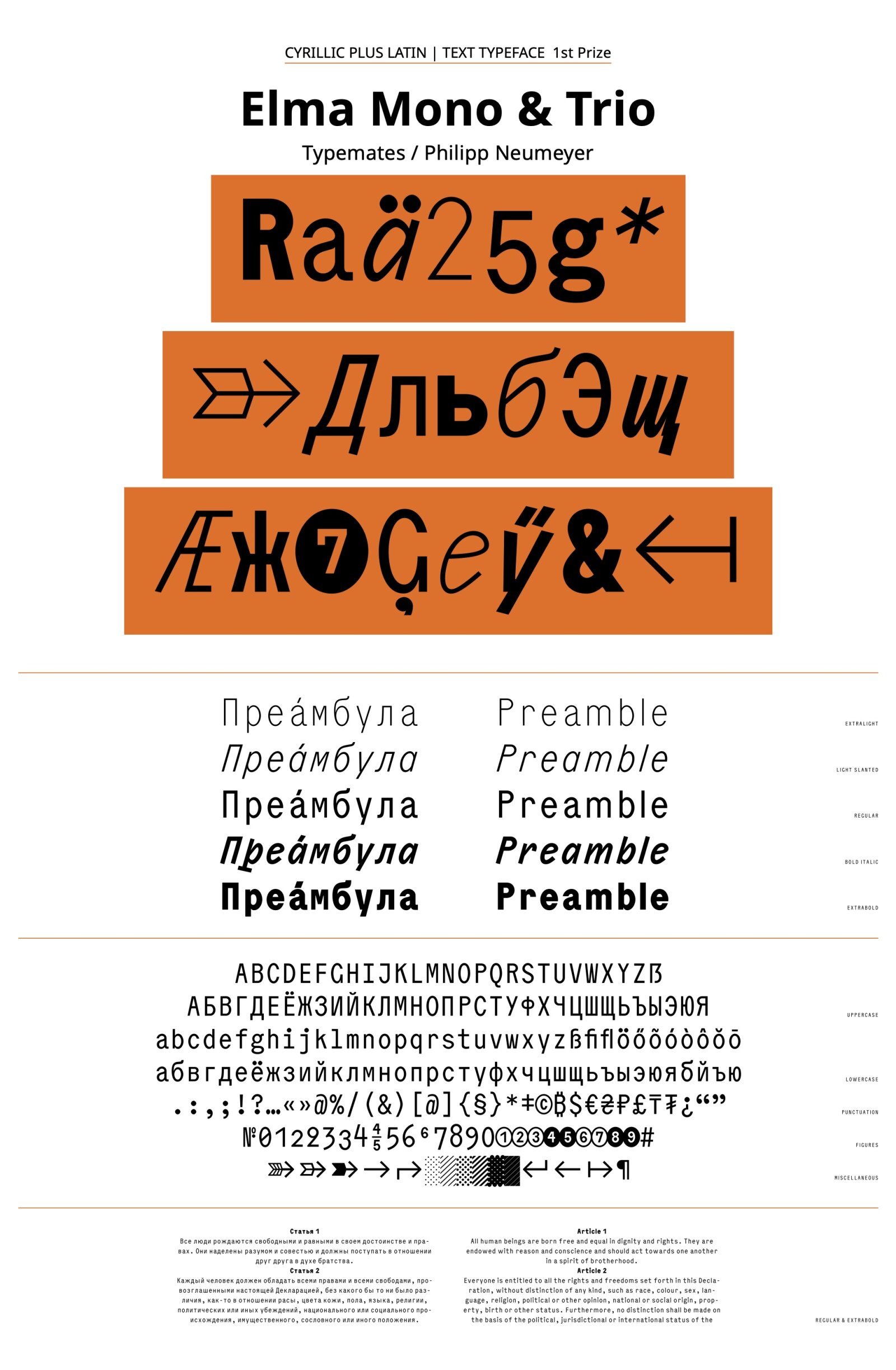 The typeface is a system of two fixed-width families—Mono and Trio—that operate at the intersection of pragmatism and mischief. While the Mono family takes the classical monospace approach with one fixed width, the Trio works with three fixed widths to make a mockery of “legitimate” proportional designs. The fonts construction is based on a compact Neo Grotesque accented with generous spacing and a broken-curves design—deliberate rough changes of direction—that stands out used big, but blends in set small. With its wide range of weights, from Extralight to Extrabold, and not just one but two corresponding 16° angled versions—an Italic and a Slanted—the typeface can set the mood, whatever it may be. With more than 820 glyphs per style and native-approved Cyrillic the font speaks more than 270 languages. Plus, it is packed with a handful of useful alternates, advantageous arrows, figures, case-sensitive punctuation and contextual alternates to make it a tool for all typographic needs.