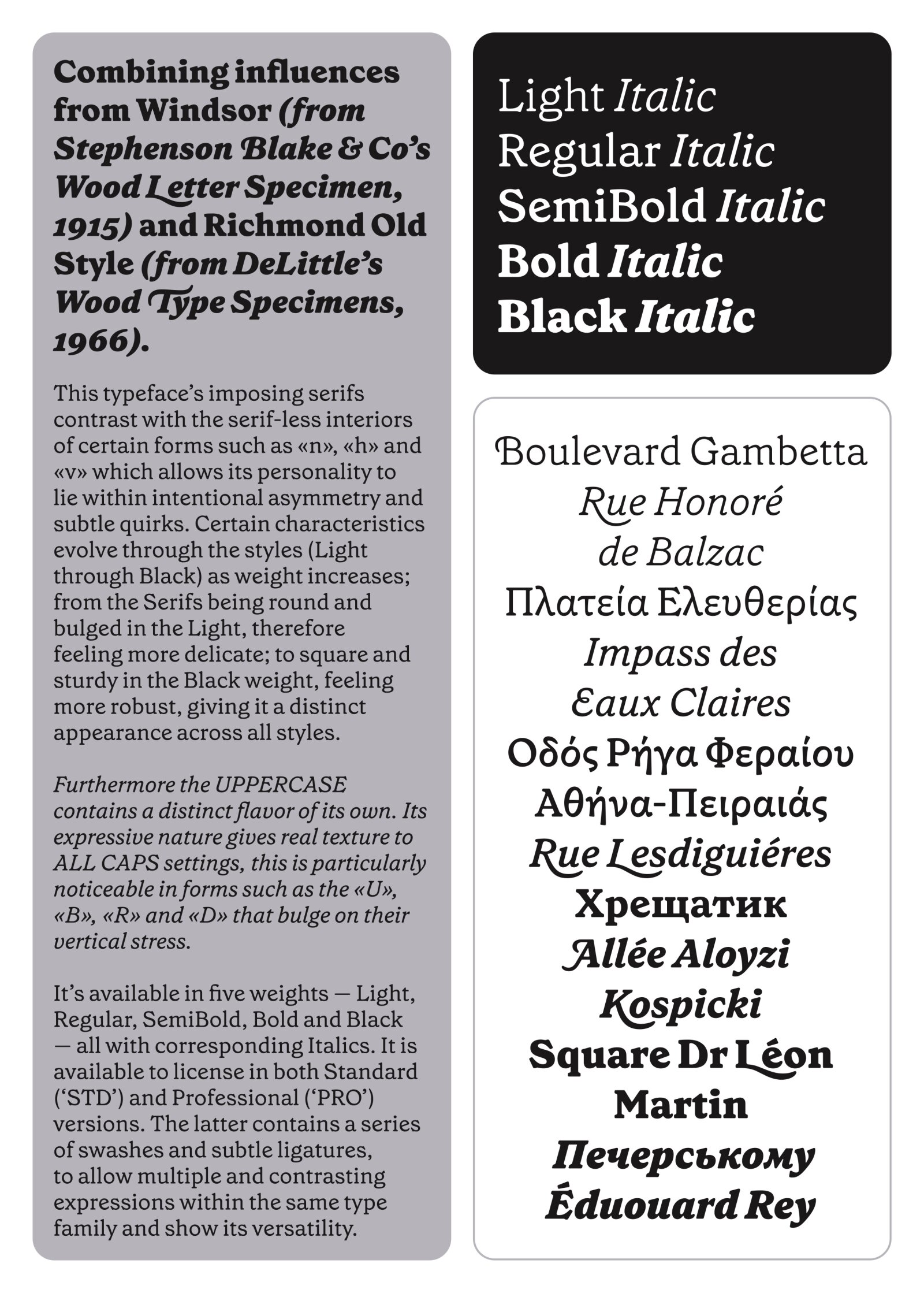Combining influences from Windsor (from Stephenson Blake & Co’s Wood Letter Specimen, 1915) and Richmond Old Style (from DeLittle’s Wood Type Specimens, 1966). This typeface’s imposing serifs contrast with the serif-less interiors of certain forms such as «n», «h» and «v» which allows its personality to lie within intentional asymmetry and subtle quirks. Certain characteristics evolve through the styles (Light through Black) as weight increases; from the Serifs being round and bulged in the Light, therefore feeling more delicate; to square and sturdy in the Black weight, feeling more robust, giving it a distinct appearance across all styles.
