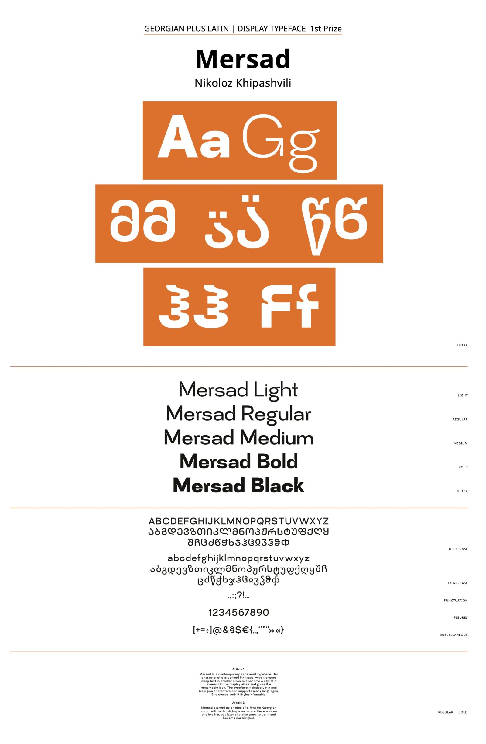 Contemporary sans serif typeface. Her characteristic is defined Ink traps, which ensure crisp text in smaller sizes but become a stylistic element in the display sizes and gives it a remarkable look. The typeface includes Latin and Georgian characters and supports many languages. She comes with 9 Styles + Variable. It started as an idea of a font for Georgian script with wide ink traps as before there was no one like her, but later she also grew to Latin and became multilingual.