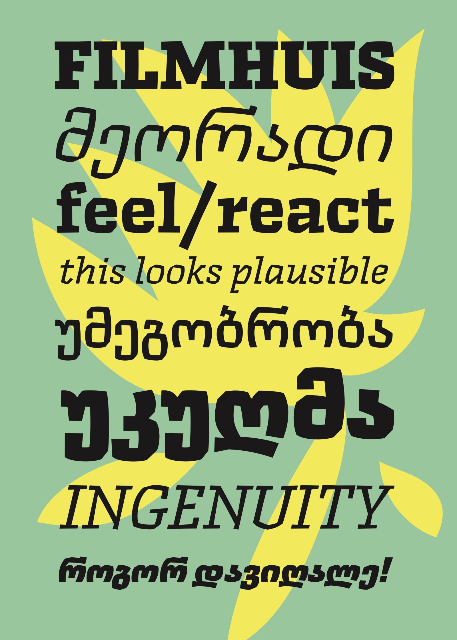 A typeface was inspired by cutting letters out of a material. With only a few cuts, the shapes remain dark and simple. With more and more cuts, the shapes become lighter and more defined. It started as a student project and for the sake of the concept had a one range between the darkest style (least cuts, sans-serif) and the lightest style (regular, serif). Now, the type family grew into having separate Text styles which are serif, and a complimentary Display styles which are sans-serif. The roughness and irregularity of strokes provide a strong character to a typeface and translating this character into other scripts such as Georgian was not only a challenge but a constant discovery of the possibilities of shapes. Although the strong character of a typeface can limit the ways of using it, text styles have a major glyphset to be used in a broad range of tasks and can be read in text point sizes.